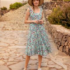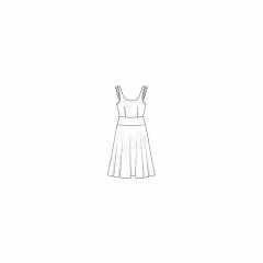 Beden 34, 36, 38, 40, 42 Arka boy 63 cm Kumaş önerisi: İnce dökümlü elbise kumaşı. Orijinal kumaş: Viskon, astar. Malzeme: Tela bant. 1 gizli fermuar, 40 cm ve özel makine ayağı.