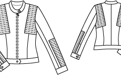 Kısa beden 17, 18, 19, 20, 21 Arka boy yaklaşık 47 cm Malzeme: Enine desenli jakar, 145 cm ende: 1.40 m her bedene. Dore deri. 17 beden için 1 tabaka / 5 ayak deri gerekli (1 ayak = 30 x 30) cm. Daha büyük bedenler için deri ölçüsünü satıcıya sorun, modelin patronunu gösterin. Alternatif suni deri, 140 cm ende: 1.50 m. Astar, 140 cm ende: 1.10 m. Tela. Dokuma tela. İki parçalı 1metal fermuar, 45 cm, 2 metal fermuar 18 cm. 4 dikişsiz çıtçıt. Yapışkan. Kumaş önerisi: Biraz sert ce- ket kumaşı, deri ya da suni deri.