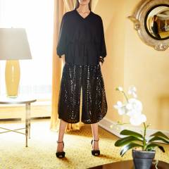 Beden 36, 38, 40, 42, 44 Yan boy 76 cm Paça bolluğu yaklaşık 90 cm Malzeme: Payet işlemeli şifon, 140 cm ende: 1.65 m her bedene. 140 cm enden saten astar: 0.80 m. 2.5 cm enden lastik: 0.75-0.75-0.80-0.85-0.90 m. Kumaş önerisi: Yumuşak dökümlü kumaş.