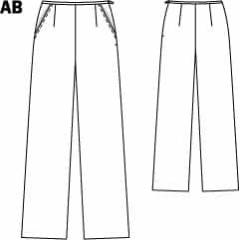 Pantolon B: 125 cm boyda desen topluluğu ile poplin, 150 cm ende: 2.50 m her bedene (2 desen topluluğu). Öteki malzeme için bkz. Model A.