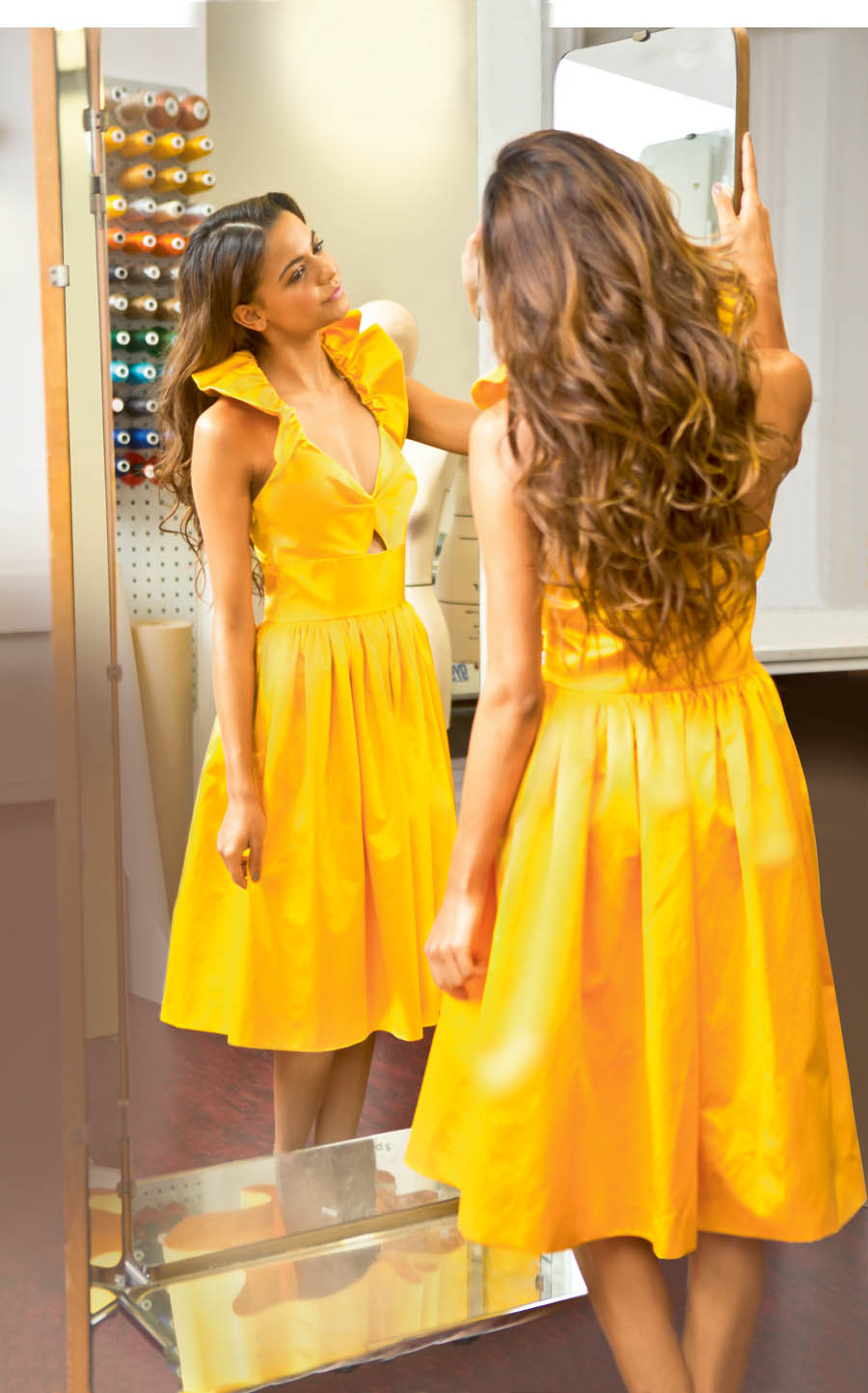 Kısa beden 17, 18, 19, 20, 21 Belden itibaren etek boyu A 52 cm, B 61 cm Malzeme: Elbise A: Dağınık renkli batist (desen boyu 106 cm), 140 cm ende: 2.70 m her bedene. 140 cm enden astar: 0.40 m. Tela. 1 gizli fermuar, 40 cm ve özel makine ayağı. 2 cm ende lastik: 0.50-0.50-0.50-0.55-0.55 m. Elbise B: 140 cm enden saten dü- şes: 2.60 m her bedene. Astar ve malzeme için bkz. model A. Kumaş önerisi: Biraz dik duran kumaş.