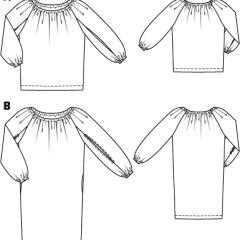 Beden 36, 38, 40, 42, 44 Belden itibaren boy: A 27 cm, B 62 cm Malzeme: Bluz A: 140 cm enden pamuklu saten: 2.10-2.10-2.10-2.10-2.50 m. 1 cm enden lastik: 1.30-1.30- 1.35- 1.35-1.40 m. Tela bant. Elbise B: 140 cm enden batist: 2.50-2.50-2.50-2.50-3.20 m. Malzeme için bkz. bluz modeli. Kumaş önerisi: İnce ama biraz dik duran kumaş.