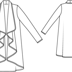 Beden 34/36, 38/40, 42/44 Arka boy yaklaşık 107 cm Kol boyu 4 cm uzun Uyarı: Manto lastik örgü desenli triko kumaştan dikilecek (lastik desen 4 cm ende), kenarlarına aynı kumaştan biye dönecek. Bu biyeleri lastik desenin arasından biçin ve çift iğne ile dikin. Baş- ka türlü triko kumaşa yünlü biye döndürün. Malzeme: Lastik örgü desenli triko kumaş, 135 cm ende: 3.60 m her bede- ne. Tela bant. Pamuklu bant, 1 cm ende: 0.25 m. Çift iğne. Kumaş önerisi: Triko kumaş.