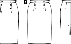Beden 36, 38, 40, 42, 44 Etek boyu 64 cm Malzeme: Etek A: Elastik pamuklu saten (enine elastik), 125 cm ende: 0.85-0.85-0.85-0.85-1.10 m). Tela. 1 gizli fermuar, 22 cm ve özel makine ayağı. 8 düğme. Etek B: Metalik iplikli kareli kumaş, 150 cm ende: 0.85 m her bedene. Tela. 1 gizli fermuar, 22 cm ve özel makine ayağı. 6 düğme. Kumaş önerisi: Düz ya da esnek etek kumaşı.