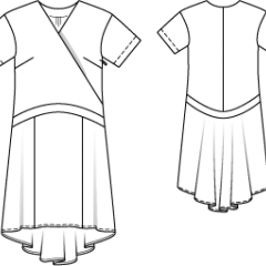 Beden 36, 38, 40, 42, 44 Belden itibaren boy ön ortada 60 cm, arka ortada 76 cm Malzeme: Kırmızı pamuklu saten, enine elastik, 145 cm ende: 1.20 m her bedene. Acı sarı pamuklu poplin, 150 cm ende: 1.50 m. Tela. 1 gizli fermuar, 40 cm ve özel makine ayağı. Kumaş önerisi: Biraz dik duran kumaş, düz ya da esnek.