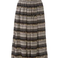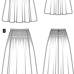 Beden 34, 36, 38, 40, 42, 44 Etek boyu A 60 cm, B 95 cm Malzeme: Etek A: 150 cm enden çizgili kumaş, enine çizgili,: 2.00 m her bedene. Pli tünel bandı, 5 cm ende: 5.00-5.00-5.10-5.10-5.25-5.25 m. Grogren bant (bel bandı), 2 cm ende: 1.40-1.50-1.55-1.65-1.70-1.80 m. 1 gizli fermuar, 27 cm ve özel makine ayağı. 1 agraf, dikişli. Etek B: Çizgi efektli kumaş, enine, 140 cm ende: 3.00 m her bedene. Pli tünel bandı, 5 cm ende: 4.60-4.60-4.80-4.80-5.00-5.00 m. Malzeme için bkz. etek A. Kumaş önerisi: İnce etek kumaşı.