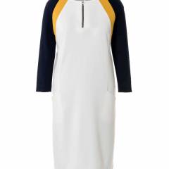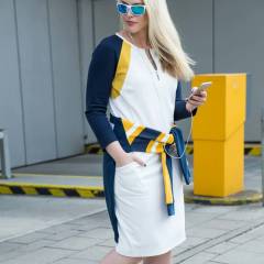 Beden 44, 46, 48, 50, 52 Belden itibaren etek boyu 62 cm Kumaş önerisi: Jarse (sert). Orijinal kumaş: Jarse yün beyazı (I), lacivert (II), acı sarı (III). Malzeme: Tela, tela bant, 1 metal fermuar, 18 cm.