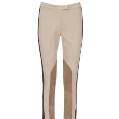 145 cm enden enine elastik kumaş: 1.15 m her bedene. Zıt renkte diyagonal yünlü yan patlar için, 150 cm ende: 0.15 m. Bacak arası ekler için süet. Bu modelin 36 bedeni için 1 tabaka toplam 9 ayak (1 ayak = 30 x 30 cm) deri kullanıldı. 1 fermuar, 12-12-12-14-14 cm. 1 basık düğme. 1 pantolon kancası.