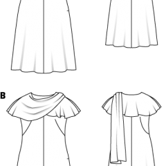 Beden 44, 46, 48, 50, 52 Belden itibaren etek boyu 74 cm Malzeme: Elbise A, B: 145 cm enden polyester krep: 3.20-3.25-3.30-3.40-3.50 m. Tela. Tela bant. 1 gizli fermuar, 40 cm ve özel makine ayağı. Kumaş: İnce ve dökümlü kumaş.