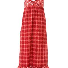 Beden 44, 46, 48, 50, 52 Belden itibaren boy 102 cm Malzeme: 115 cm enden çiçekli ince kumaş: 1.20-1.20-1.20-1.25-1.35 m. Puanlı kumaş, 110 cm ende: 2.00 m her bedene. Lastik büzgü için lastik iplik. 3 mm ende lastik: 0.85-0.90-0.95-1.00-1.05 m. Kumaş önerisi: Biraz dik duran elbise kumaşı.