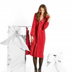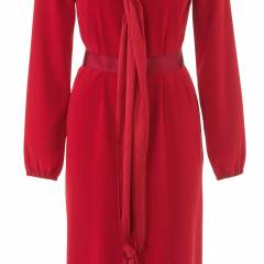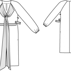 Beden 36, 38, 40, 42, 44 Malzeme: Krep saten: 1.35 cm en: Bd: 36, 38, 40, 42: 2.00 m, Bd: 44: 2.50 m. Garnitür kumaş olarak boyuna oluklu krep saten, 115 cm ende: 1.35 m her bedene. 0.45 m tela, 90 cm ende. 1 gizli fermuar, 40 cm ve özel makine ayağı. Lastik, 6 mm ende: 0.50 m. İplik. Kemer için grogren bant, 4 cm ende: Bd 36: 1.55 m, Bd 38: 1.60 m, Bd 40: 1.70 m, Bd 42: 1.80 m, Bd 44: 1.90 m. Cırt bant parçası 4 cm uzunluk, 2 cm en. Kumaş önerisi: İnce ama biraz sert elbise kumaşı. 2 yüzü güzel garnitür kumaş.
