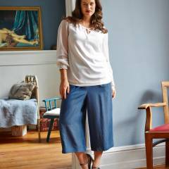 Beden 44, 46, 48, 50, 52 Yan boy belden itibaren 82 cm (bel bandı ortası = bel) Malzeme: 150 cm ende kot kumaşı: 1.75-1.75-1.75- 1.80-1.80 m. Tela. Lastik, 3 cm ende: 0.45-0.50-0.50-0.55-0.55 m. 1 gizli fermuar, 40 cm ve özel makine ayağı. Kumaş önerisi: Biraz dik duran kumaş.