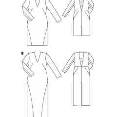 Beden 44, 46, 48, 50, 52 Belden itibaren boy A 72 cm, B 114 cm Malzeme: 145 cm ende enine elastik yünlü saten:2.05-2.10-2.20-2.25-2.30m. Garnitür kumaş olarak organze, 140 cm ende: 0.60 m her bedene. Tela. 1 gizli fermuar, 40 cm ve özel makine ayağı. Elbise B: Krep saten, 130 cm ende:2.90-2.90-2.90-3.20-3.20 m. Malzeme için bkz. model A. Kumaş önerisi: Biraz dik duran, düz ya da esnek kumaş.