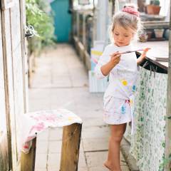 Beden 92, 98, 104, 110, 116 Arka boy 48-51-54-56-59 cm Uyarı: Bu modeli dikerken şablon kullanarak beyaz jarse kumaşa renkli akrilik boya lekeleri yaptık. Kumaşı boyamadan önce yıkayın. Kumaşı biçtikten sonra boyayın, sonra dikin. Malzeme: 140 cm ende pamuklu jarse: 1.10-1.15-1.20-1.25-1.30 m. Tela. Fiyonk için yumuşak grogren bant, 2.5 cm ende: 0.50 m. 1 düğme. Çift iğne. Kumaş boyama için: Şablon, pembe, sarı, yeşil ve türkuaz akrilik boya, 1 fırça.