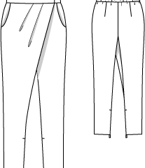 Beden 44, 46, 48, 50, 52 Pantolonun yan uzunluğu 107 cm Paça bolluğu 31-32-33-34-35 cm Malzeme: Jakar, 130 cm ende: 2.35-2.35- 2.35-2.50-2.50 m. Tela. Tela bant. Lastik, 2.5 cm ende: 1.00-1.00-1.10-1.15-1.20 m. 2 gizli fermuar, 22 cm ve özel makine ayağı. 2 yassı düğme. Kumaş önerisi: İnce ama biraz sert kumaş.