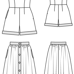 Beden 34, 36, 38, 40, 42 Etek boyu 78 cm Yandan pantolon boyu 41 cm Malzeme: Çiçekli pamuklu, 140 cm eninde: 3,50 m tüm bedenler için. Düz pike, 130 cm eninde: 0,85 m. Tela. Tela form bandı. 40 cm uzunlukta fermuar ve fermuar ayağı. 5 düğme (etek) ve 2 küçük düğme (askı) Kumaş önerisi: Viskon, pamuk ya da karışımlı tok kumaşlar